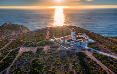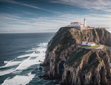 Drone view of Cabo da Roca lighthouse perched on cliff overlooking seascape in Portugal. The red roofed lighthouse stands as striking landmark, highlighting dramatic beauty of coastal location