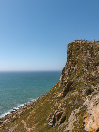 Steep rocky cliff with people on top, overlooking the vast Atlantic Ocean under a clear blue sky near Lisbon, Portugal. Ideal for travel, adventure, and nature concepts.