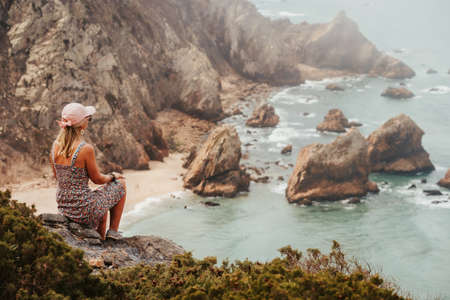 Beautiful blond women enjoying ocean breeze on coastline of Praia da Ursa Beach in morning light. Surreal scenery of Sintra, Portugal. Atlantic Ocean coastline landscape