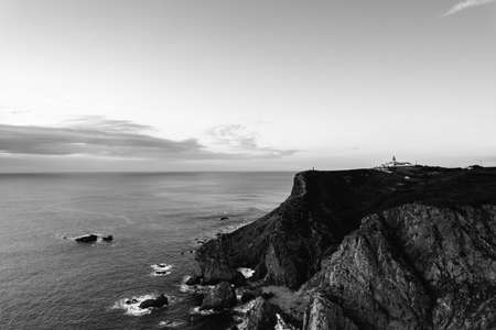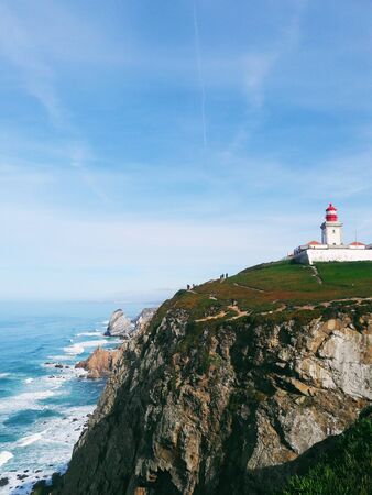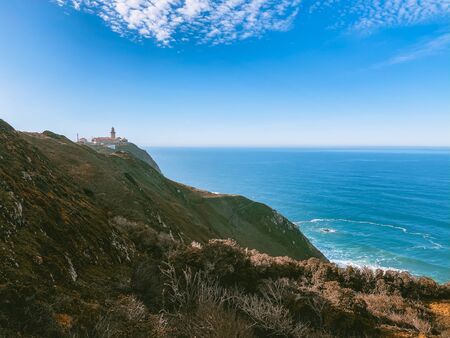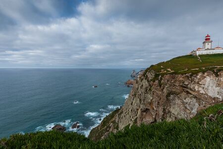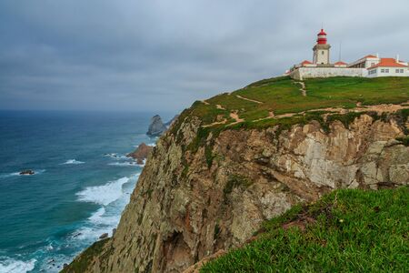 Cliffs and lighthouse of Cabo da Roca on the Atlantic Ocean in Sintra, Portugal, the westernmost point on the continent of Europe, where the land ends and the sea begins.