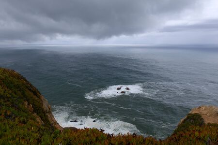 Storm in Atlantic ocean, Cabo da Roca, Portugal. Dark clouds above the sea, seascape.