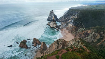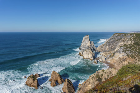 Panorama of the ocean coast and rock bay, Atlantic Ocean, beautiful cloudscape, dramatic landscape, colorful seascape with sheer rocks, travel content, Lisbon, Portugal