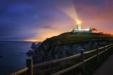 Sintra Portugal. Lighthouse on Cape Roca. Travel and hiking path lit by golden sunset light. Tourism landmark with beautiful coastline cliffs along atlantic ocean coast