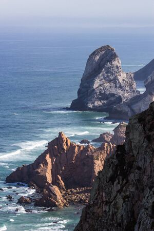 Sunset at Ursa Beach Sea stack, Portugal. Atlantic Ocean Foamy waves rolling to rocks. Holiday vacation landscape scene