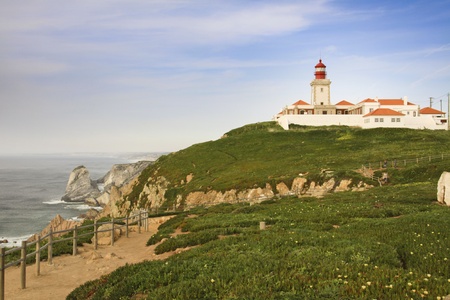 Lighthouse building at Cape Roca on the Atlantic coast of Portugal.