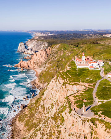 Aerial view of Cabo da Roca lighthouse with majestic coastline looking the Atlantic Ocean, a famous landmark in Colares, Lisbon, Portugal.