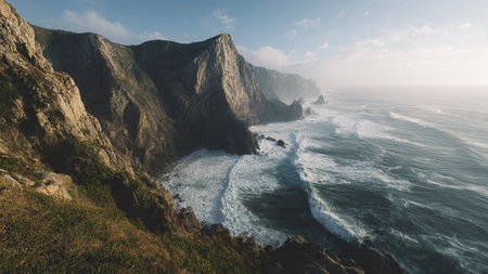 Panoramic view of rugged coastal cliffs and deep blue Atlantic Ocean near Lisbon, perfect for travel, adventure, and nature backgrounds or website banners.