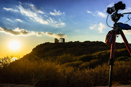 Greece Cape Sounion. Professional camera on tripod taking picture film video from ruins of an ancient temple of Poseidon at sunset. Travel destinations.