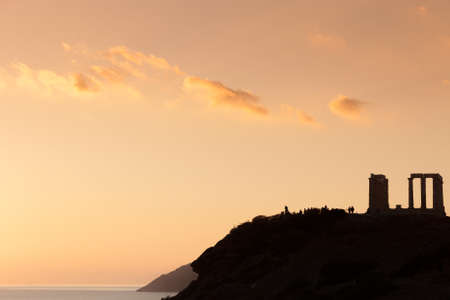 Greece Cape Sounio. Ruins of an ancient temple of Poseidon, Greek god of the sea, on sunset.Tourist landmark of Attica, Sounion, Greece