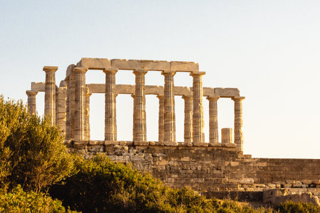 Greece Cape Sounio. Ruins of an ancient temple of Poseidon, Greek god of the sea, on sunset. Tourist landmark of Attica, Sounion, Greece
