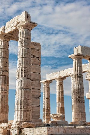 Temple of Poseidon at Sounion, Greece. Ruins and sky clouds