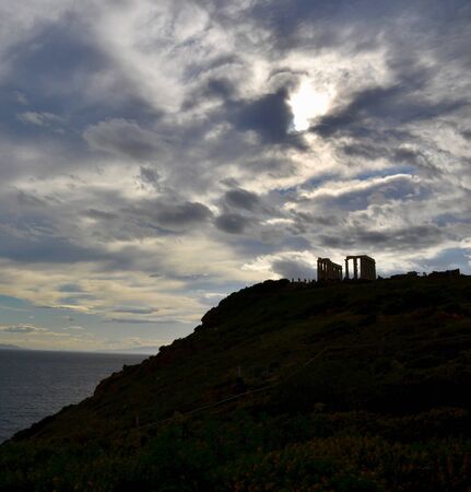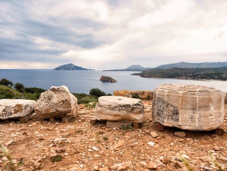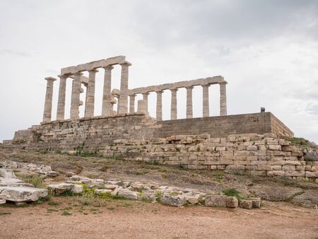Panoramic view of the remains of a Greek temple dedicated to Poseidon, on the cape of Cape Sunio, located on the southern tip of Attica, the region of Athens, Greece