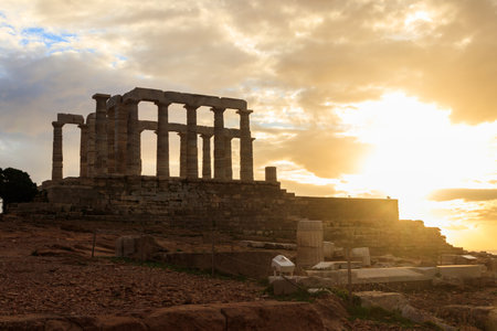 Cape Sounio sunset at Sounion with ruins of the iconic Poseidon temple. One of the Twelve Olympian Gods of ancient Greek religion and mythology. God of the sea, earthquakes. Aegean coast, Greece.