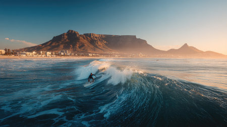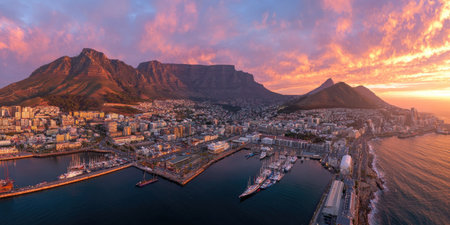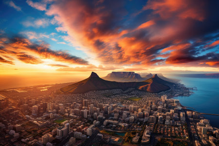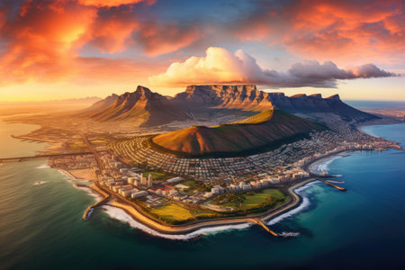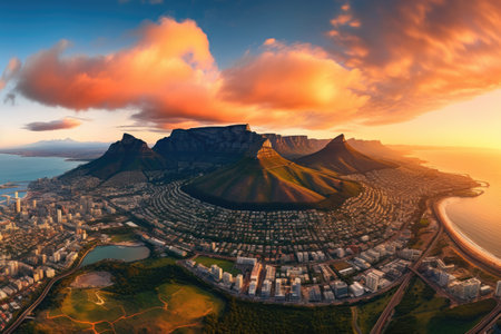 Aerial view of Table Mountain and Cape Town, South Africa. Aerial panoramic view of Cape Town cityscape at sunset, AI Generated
