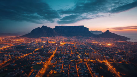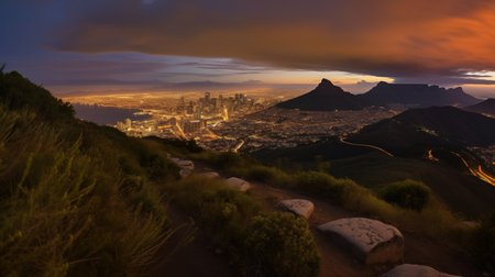 A breathtaking view from Lion's Head sunset hiking trail, featuring Table Mountain silhouetted against magical twilight hues, with the sparkling city lights of Cape Town below. AI-generated
