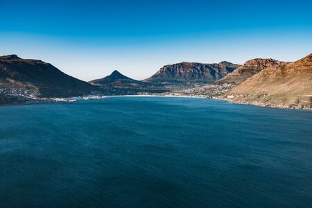 Aerial view of Cape Town, South Africa, showcasing the stunning coastline, residential buildings, and the iconic Table Mountain range with clear skies and ocean waves.
