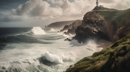 A breathtaking view of a lighthouse on a grass-covered hill by the ocean on a cloudy day