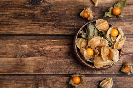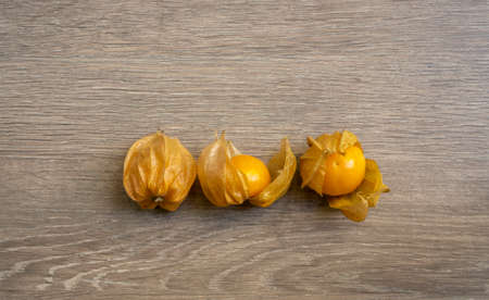 Cape gooseberry or physalis minima on wood background. Tropical fruit and food for health concept.