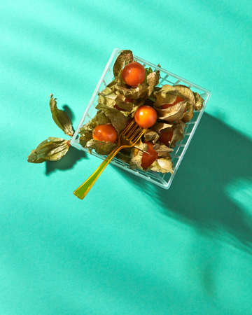 Orange physalis in a basket with a fork represented on a green background