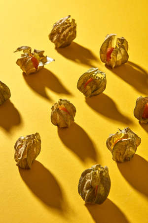 Top view close up of a pattern with yellow physalis fruit with shadows on a yellow background