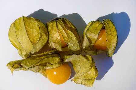 Ripe yellow physalis fruit berries or Physalis peruviana, edible physalis species. Small golden berries close up. Vegetarian food. Experience of a healthy lifestyle. White background.