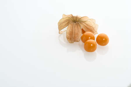 group of alkekengi ripe fruits on white reflective surface, copy space