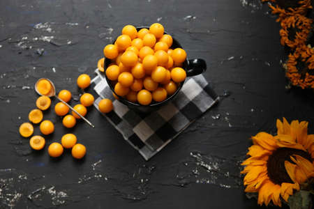 Yellow plums on the black background. Ingredients for a jam. Food photography. Yellow sunflower, top view. Autumn Concept,