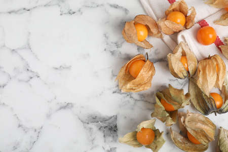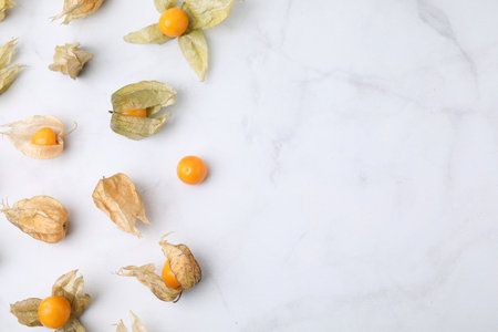 Ripe physalis fruits with calyxes on white marble table, flat lay. Space for text