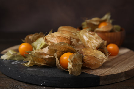 Physalis or Chinese lantern fruit decorated on a wooden table