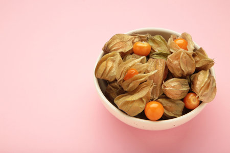 Physalis peruviana fruit on light plate on pink background. Top view