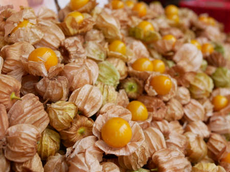 Selective focus of juicy ripe Cape gooseberry fruits, Physalis peruviana, Goldenberry, Poha, for sale at a local market