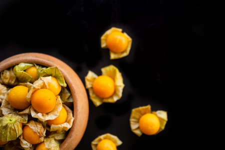 Fresh physalis fruit on black background. Healthy eating.