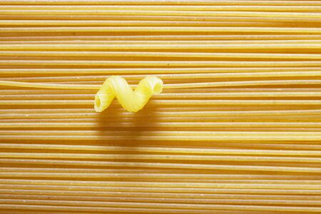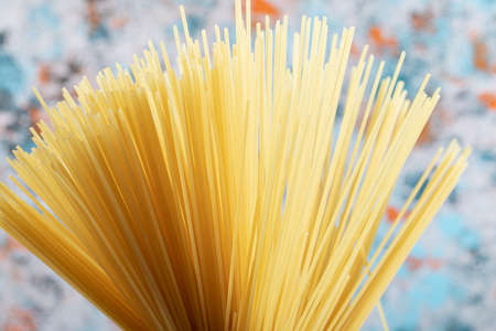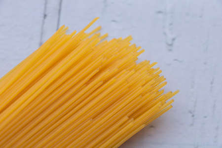 Cooking Italian pasta concept. Bunch of raw yellow spaghetti