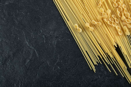 Uncooked pasta spaghetti macaroni on dark rustic background