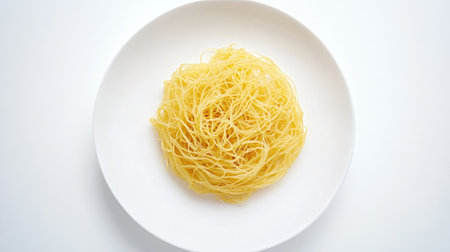Uncooked vermicelli pasta in glass bowl isolated on white background, top view. Food banner with place for text.