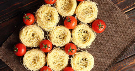 Top view of arranged raw pasta heaps with fresh wet tomatoes on canvas napkin on top of wooden table