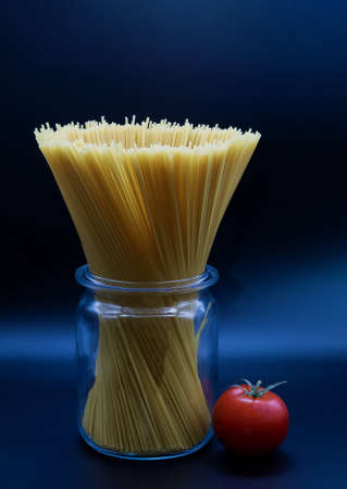 spaghetti standing in a trasparent glass jar on a blue background and a ripe tomato lying next to the can is close shot in the studio