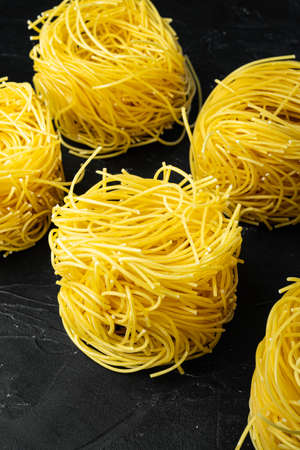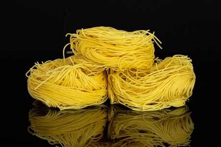 Group of three whole raw pasta angel hair nest shaped isolated on black glass