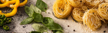 raw Italian Capellini with vegetables on flour on black background, panoramic shot