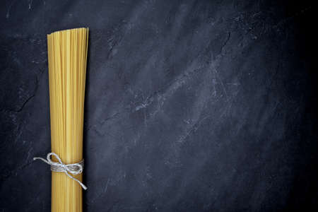 Spaghetti on dark background. Texture. Long spaghetti. Raw spaghetti concept. Top view. Flat lay. From above. Copy space.