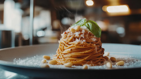 A close-up of spaghetti topped with a vibrant pesto sauce, sprinkled with pine nuts and Parmesan, beautifully plated with a sprig of basil for an elegant touch.