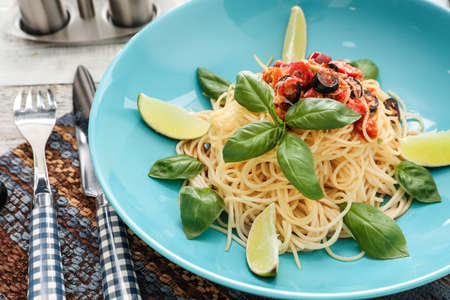 Plate of tasty Pasta Puttanesca on table, closeup