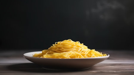 A simple and appealing presentation of freshly cooked spaghetti noodles, elegantly arranged on a round white plate with a minimalist backdrop.