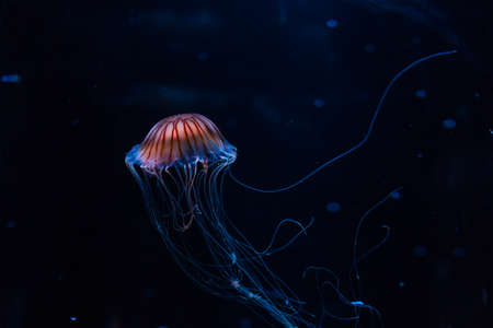 Fluorescent jellyfish swimming underwater aquarium pool with red neon light. The Japanese sea nettle chrysaora pacifica in blue water, ocean. Theriology, biodiversity, undersea life, aquatic organism