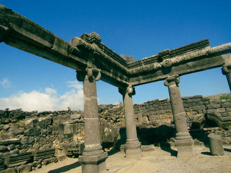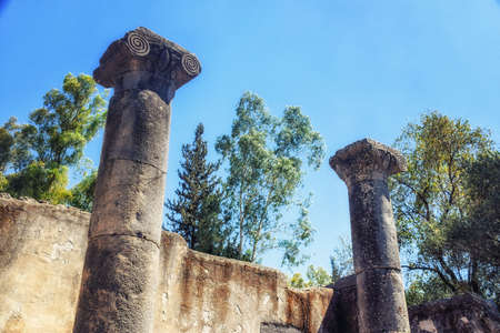 Ruins of ancient Roman temple in the town of Capernaum (Galilee, Israel)