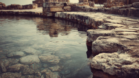 Stone channels form an ancient water system with clear water reflecting the surroundings and showing the craftsmanship of the builders.
