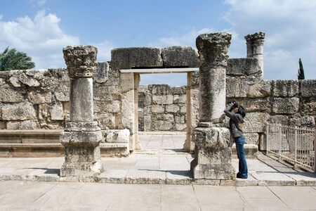 Young woman taking photos in old city Capharnaum of Israel