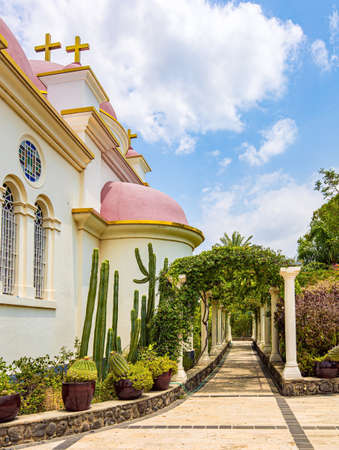 The Monastery of the Holy Twelve Apostles in Capernaum on the shores of Lake Tiberias. Israel. Snow-white church building with pink domes and golden crosses. Place of worship and pilgrimage.
