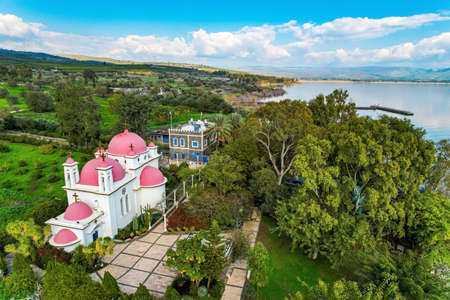 Calm winter day on the shores of Lake Kinneret. Tropical park around the Church. Greek Orthodox monastery of the Twelve Apostles in Capernaum. Photo taken from a drone. Israel.