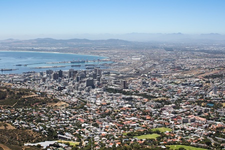 View of the central business district, harbor and residential areas of Cape Town as seen from the lower cable station on Table Mountain